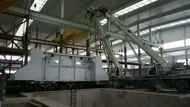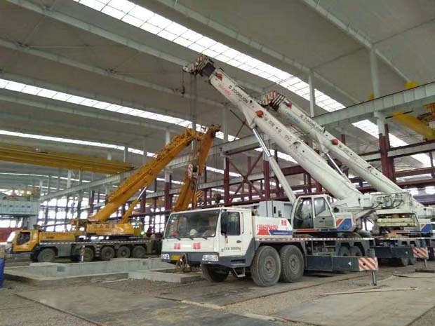 青島泰力起重安裝有限公司動用三臺110噸 1臺130噸吊車聯(lián)手配合抬裝190噸德國進口設(shè)備助力一汽大眾奧迪設(shè)備搬運吊裝安裝現(xiàn)場。